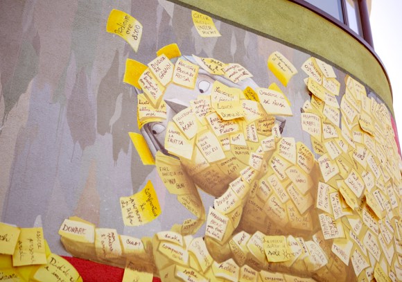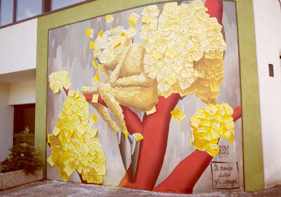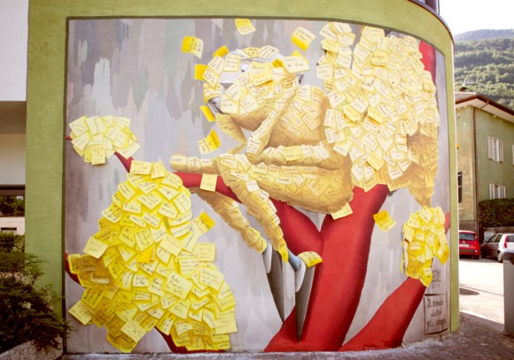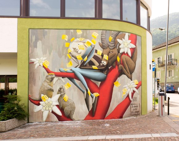 “Il mondo dietro gli impegni” è il murales di Zed1, ma è da considerare un’opera collettiva, data la partecipazione della piccola comunità di Laives, vicino Bolzano. Il muro è posto ad uno degli ingressi dell’Istituto Comprensivo di Laives, che ospita le scuole medie italiane e tedesche, la scuola dell’infanzia, una palestra con piscine ed un teatro, oltre ai vari bar e parchi nei dintorni. Si intravedono due occhi, tra centinaia di post-it gialli che riempiono il primo livello del Second Skin. Svolazzano appunti, impegni, consigli e pro-memoria: “Fare i compiti”, “Andare a lezione di nuoto”, “Bisogna essere coraggiosi”, “Dare un nome al vento”, “Votare Capo Fortuna”, “Fare l’artista”. Sono centinaia i messaggi raccolti dai bambini, genitori, persone di passaggio e vicini. L’interazione e lo scambio attivo con il territorio è uno degli aspetti fondamentali del lavoro di artista di strada, impossibile da prevedere in un bozzetto ed incasellare in un processo burocratico, eppure, ne incarna la parte più vera ed affascinante. Tanto più se ci troviamo in piccole comunità. L’ultimo giorno di scuola i bambini sono stati invitati a strappare via dagli occhi i post-it, per scoprire stelle alpine, marmotte e stambecchi nascosti sotto al muro dal Second Skin. Giocando su una forte senso di auto-ironia, considerato che gli artisti urbani viaggiano molto ma spesso vedono solo il muro che devono dipingere, Zed1 ha voluto dire di non perdere mai di vista il bello che ci circonda e di trovare il tempo per godersi la vita senza pensare solo agli impegni.