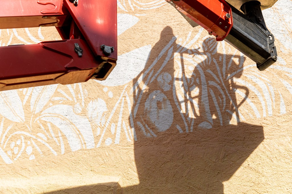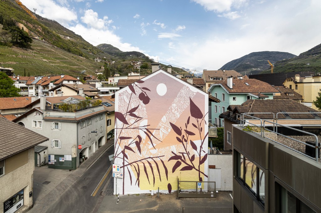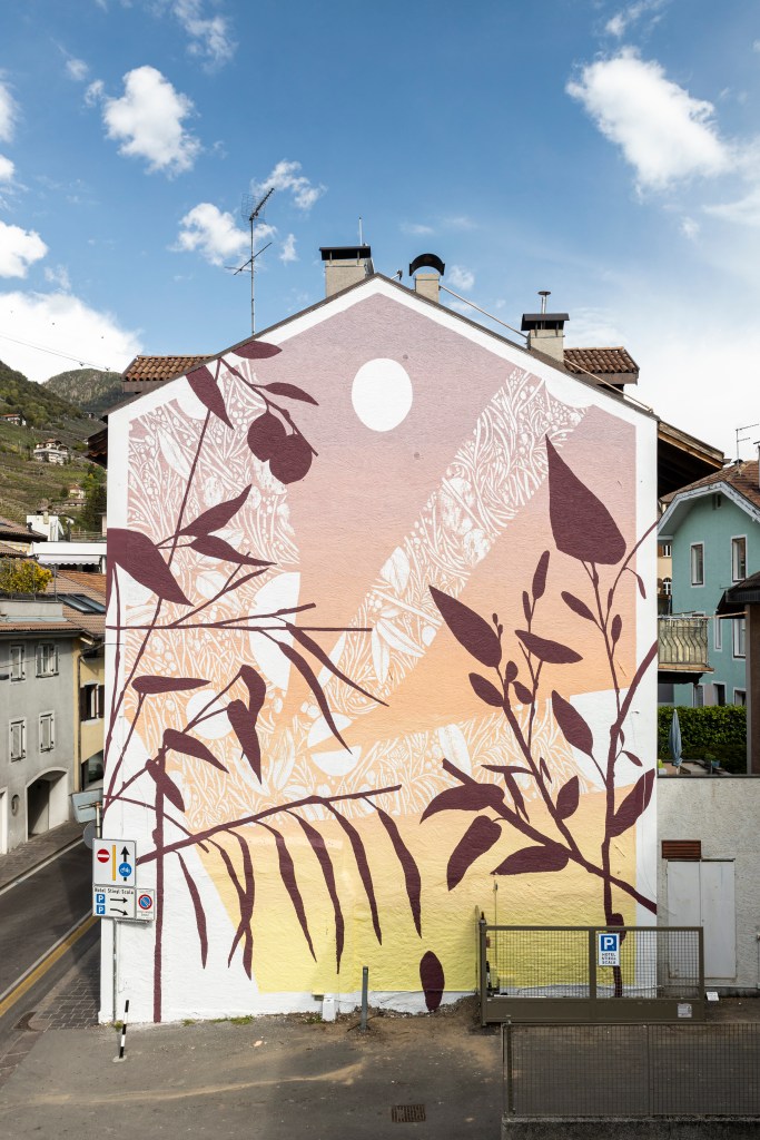 La serie “Mimesi”, iniziata a Ragusa all’interno del progetto “Bitume”, arriva a Bolzano con un’opera che, in piena pandemia, rappresenta da una parte la volontà della popolazione altoatesina a tornare ad instaurare un contatto con la natura, e dall’altra la natura che riprende e invade gli spazi urbani. Le piante illustrate dall’artista nell’opera sono quelle che i ricercatori A. Speak e S. Zerbe hanno individuato come specie adatte per popolare i centri urbani nelle Alpi meridionali.